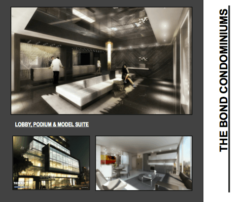 “What is THE BOND? It’s a connection, a destination, a state of mind. It’s an iconic address in the heart of downtown Toronto, steps to the city’s most celebrated cultural, fashion, and sporting landmarks. THE BOND is a modern condominium residence at the cutting edge of design and style. It’s Urban Expressionism at its finest.Rising 40 storeys above the intersection of Adelaide Street and John Street, THE BOND is a soaring vision of translucent glass and steel with balconies and terraces punctuating its contemporary facade. An impressive podium Lobby, beautifully appointed with gleaming columns, lush plantings and art accents, welcomes visitors and residents. THE BOND offers a wide selection of one-, two- and three-bedroom suites and grand penthouses, designed and oriented for spectacular views and detailed with immaculate elegance.” (Images and description courtesy of http://www.thebond.ca)