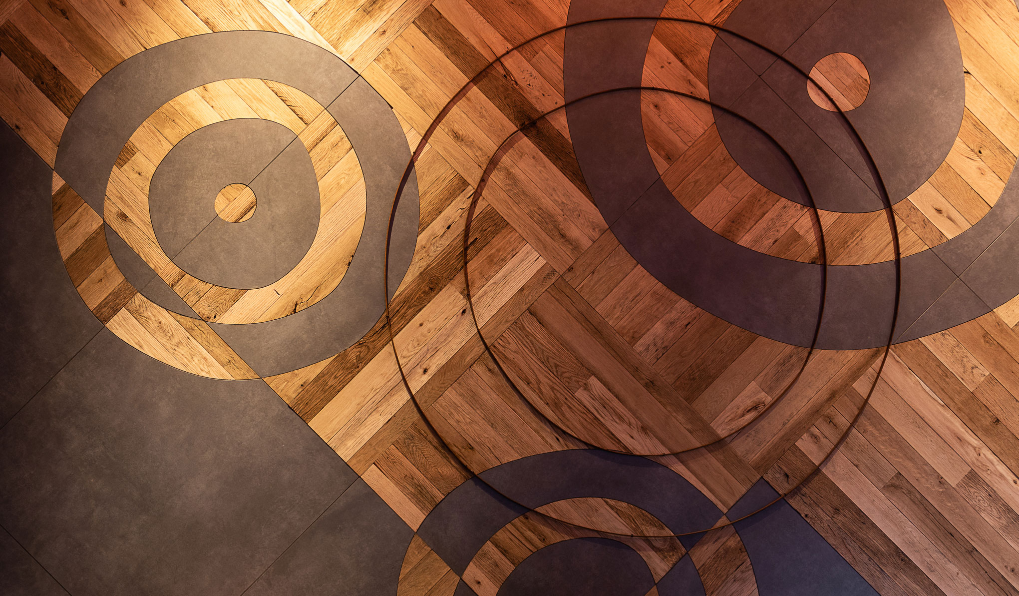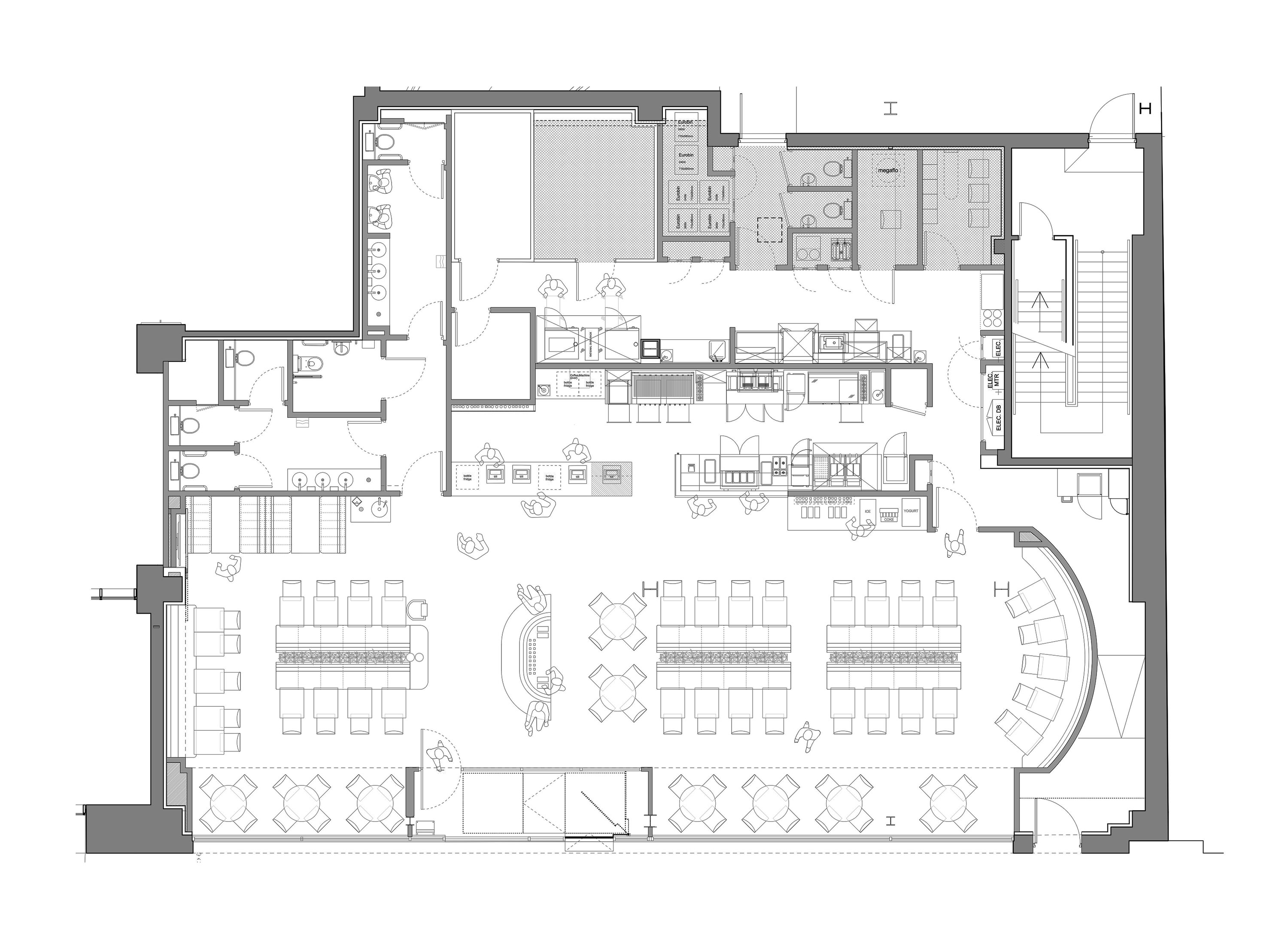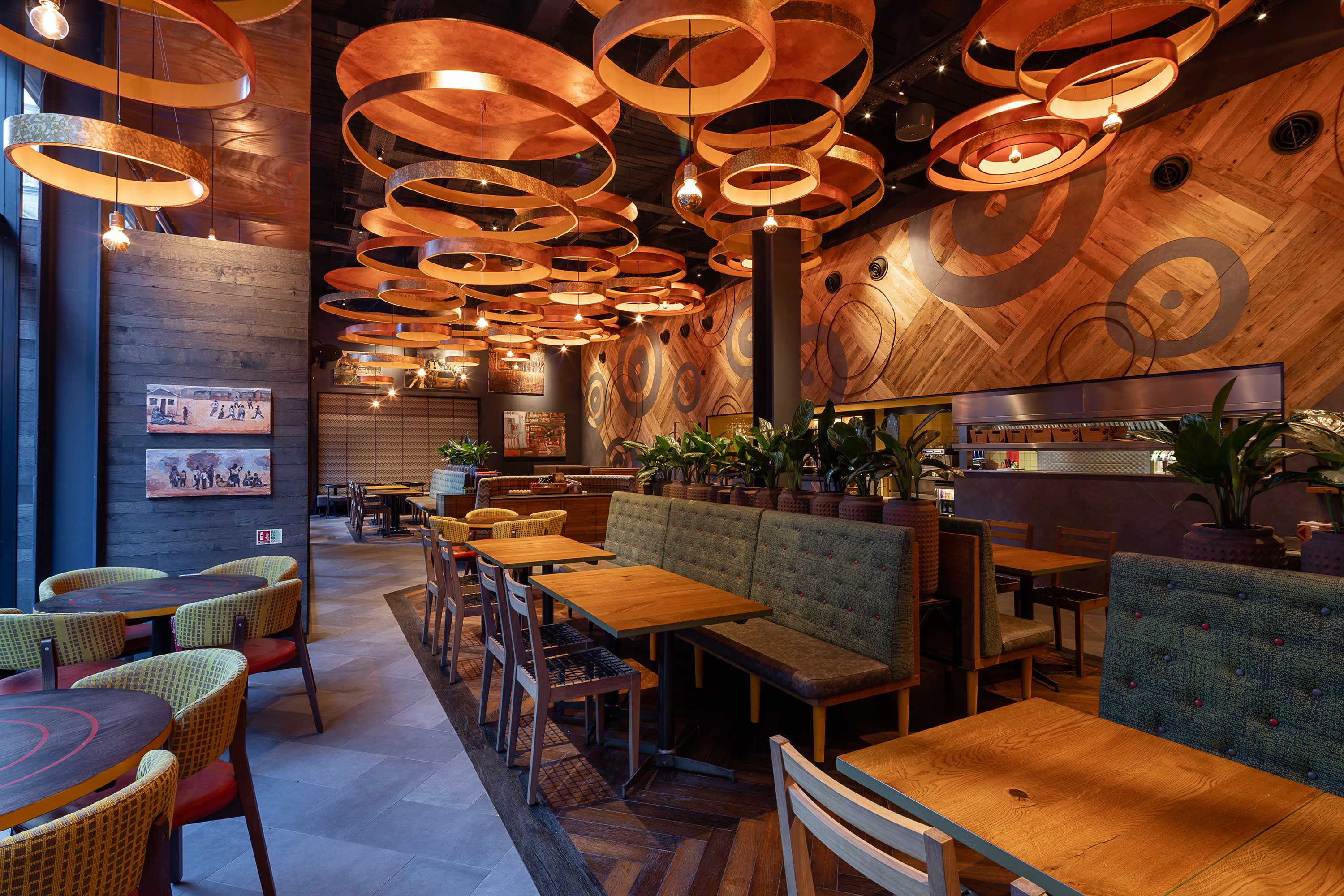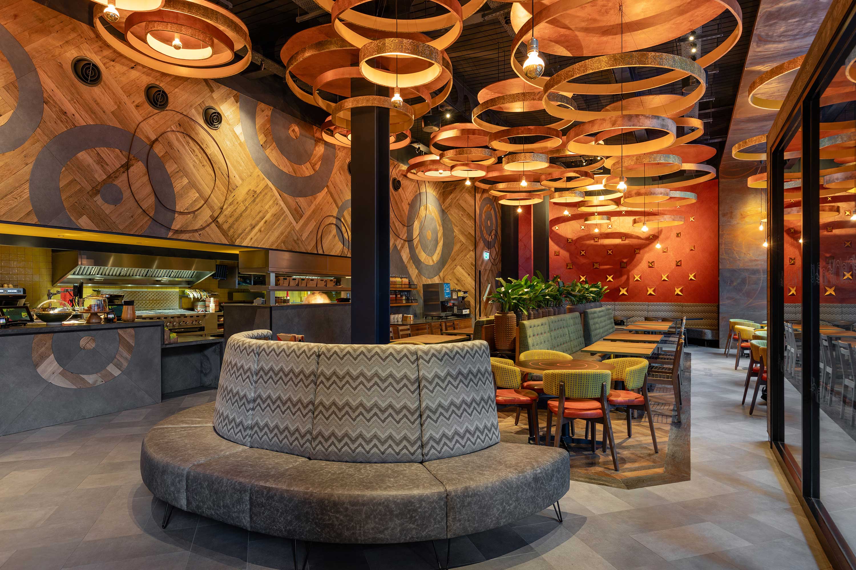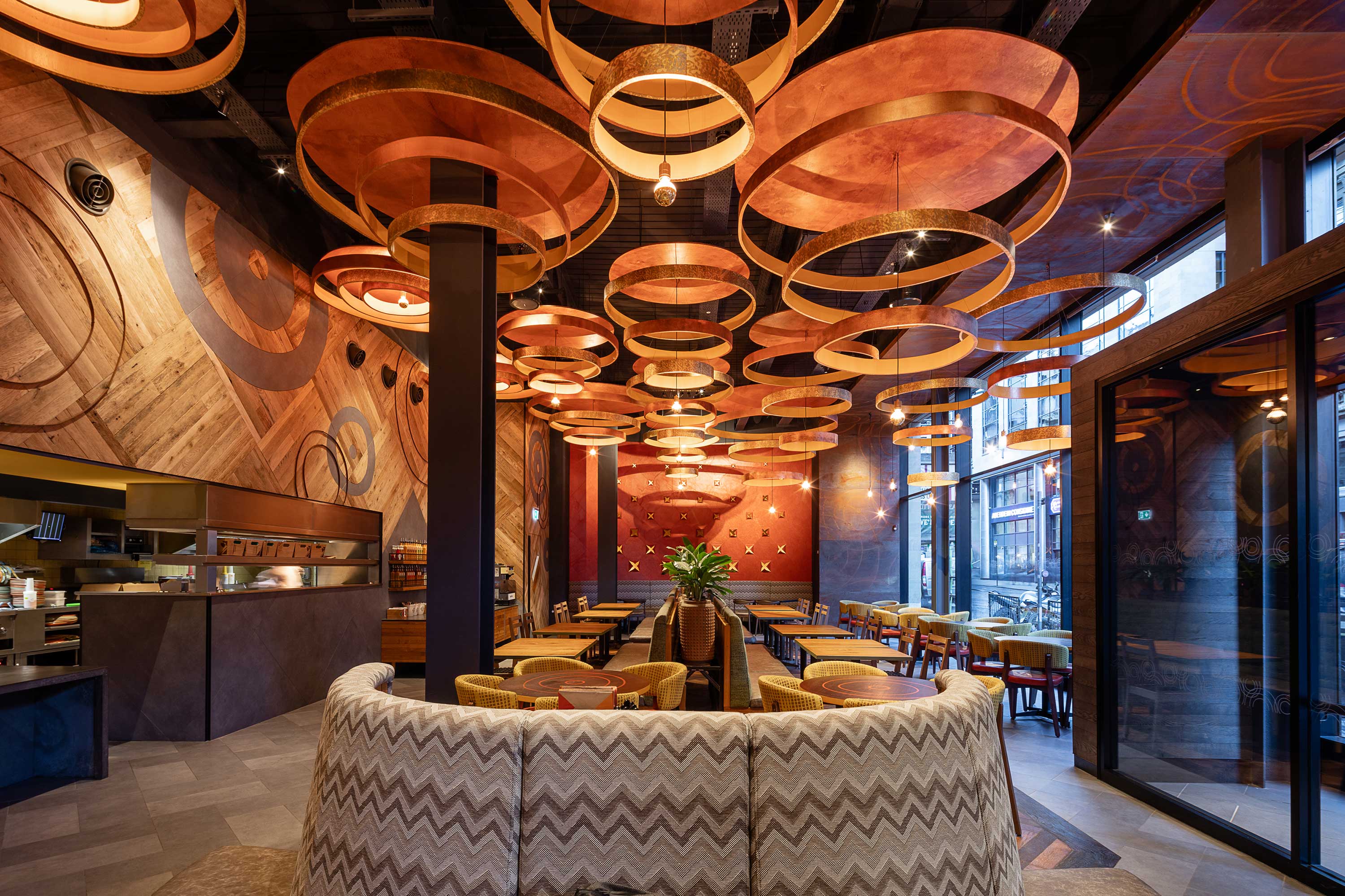 This new-build restaurant occupies the ground floor of a commercial building directly opposite the Glasgow Central train station. A strong, symmetrical floor plan is set off by the organic, circular pattern that dominates the design theme. The circular motif of the ceiling installation was repeated on the internal shopfront surround by masking and rusting steel sheets and on the rear wall through a combination of CNC cut reclaimed timber and ceramic tiles. In order to achieve considerable value engineering, the ceiling feature, originally designed in metal, was cleverly constructed with MDF and copper- leafed by an artist to achieve the desired affect. Furnishings consist of chairs handcrafted in South Africa and long banquette seating offering maximum flexibility for table groupings. The result is a warm, inviting space with a dynamic patternality throughout. Andy was the principal designer for all phases of this project.
